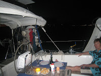 Ankkuripaikalla kävi miellyttävä vilpoinen tuuli. Nautimme iltapalan veneen kannella katsellen kaupungin valoja.